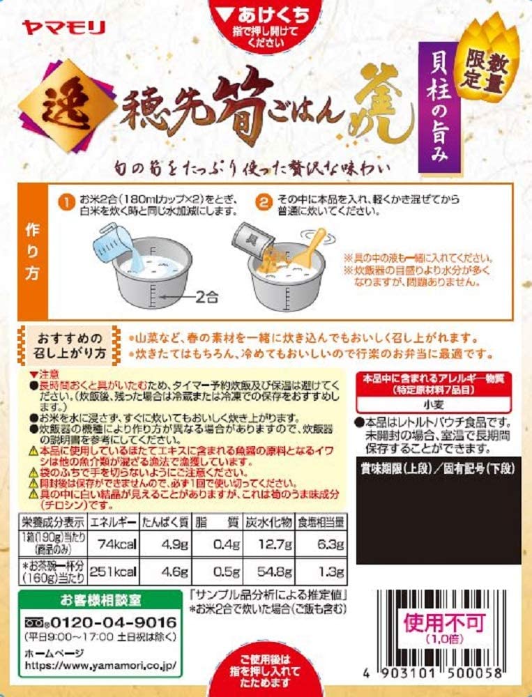 原材料:野菜(たけのこ、せり)、だししょうゆ(小麦・さば・大豆を含む)、しょうゆ(小麦・大豆を含む)、砂糖、ほたて貝柱水煮フレーク、ほたてエキス(大豆・豚肉を含む)、かつおぶしエキス、食塩、たん白加水分解物(大豆を含む)/増粘剤(加工でん粉)、調味料(アミノ酸等)