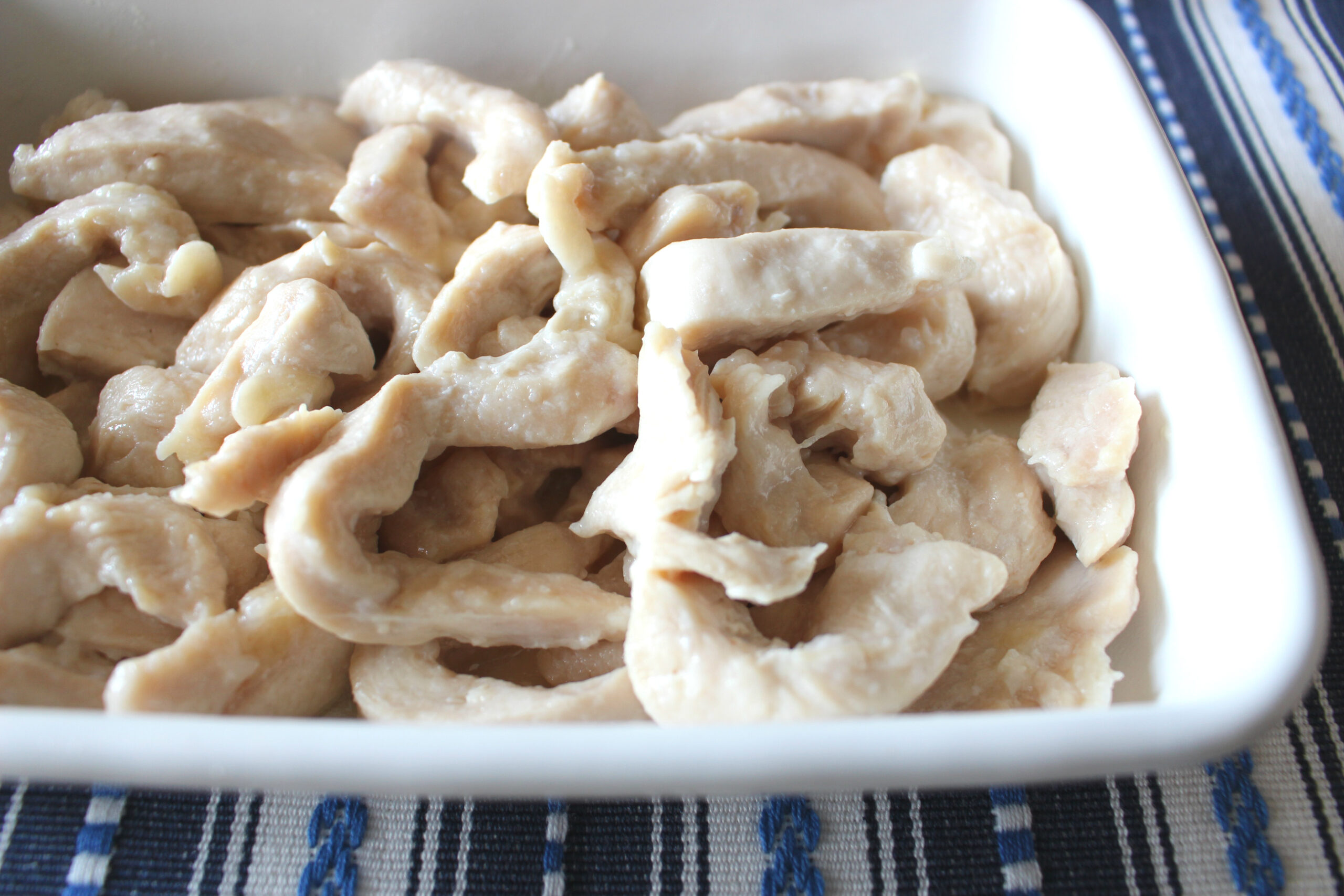 - 鶏むね肉を2cm幅にスライスし耐熱容器に入れ、レンジで600Wで2分加熱。