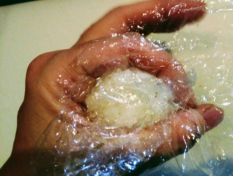 - 酢飯を20g程度ラップに取り、指を輪にして抑え、玉子型に握る。