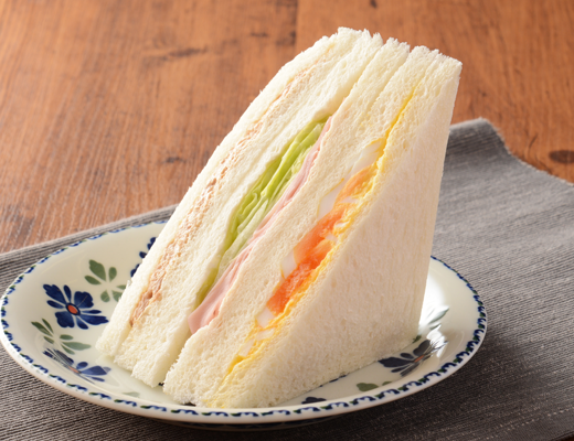 ハムを増量しています。トマトとハムレタス、たまごサラダときゅうりが楽しめるサンドです。